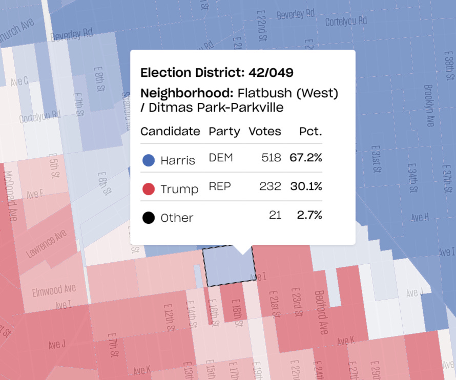 [Map from The City, depicting voting patterns across the city in November, 2024. This is my voting district.]